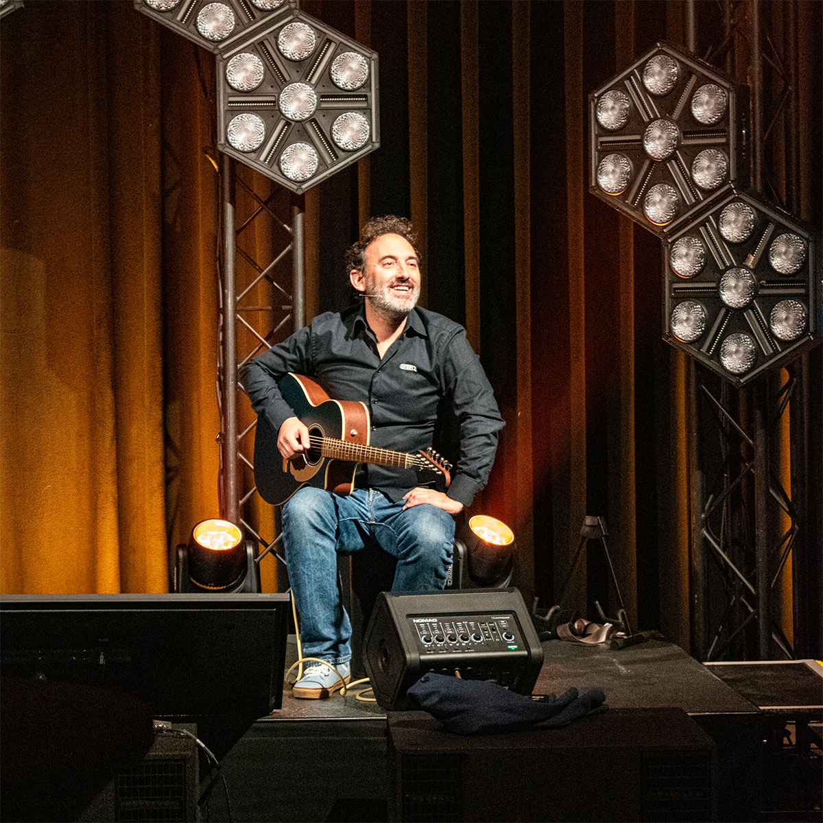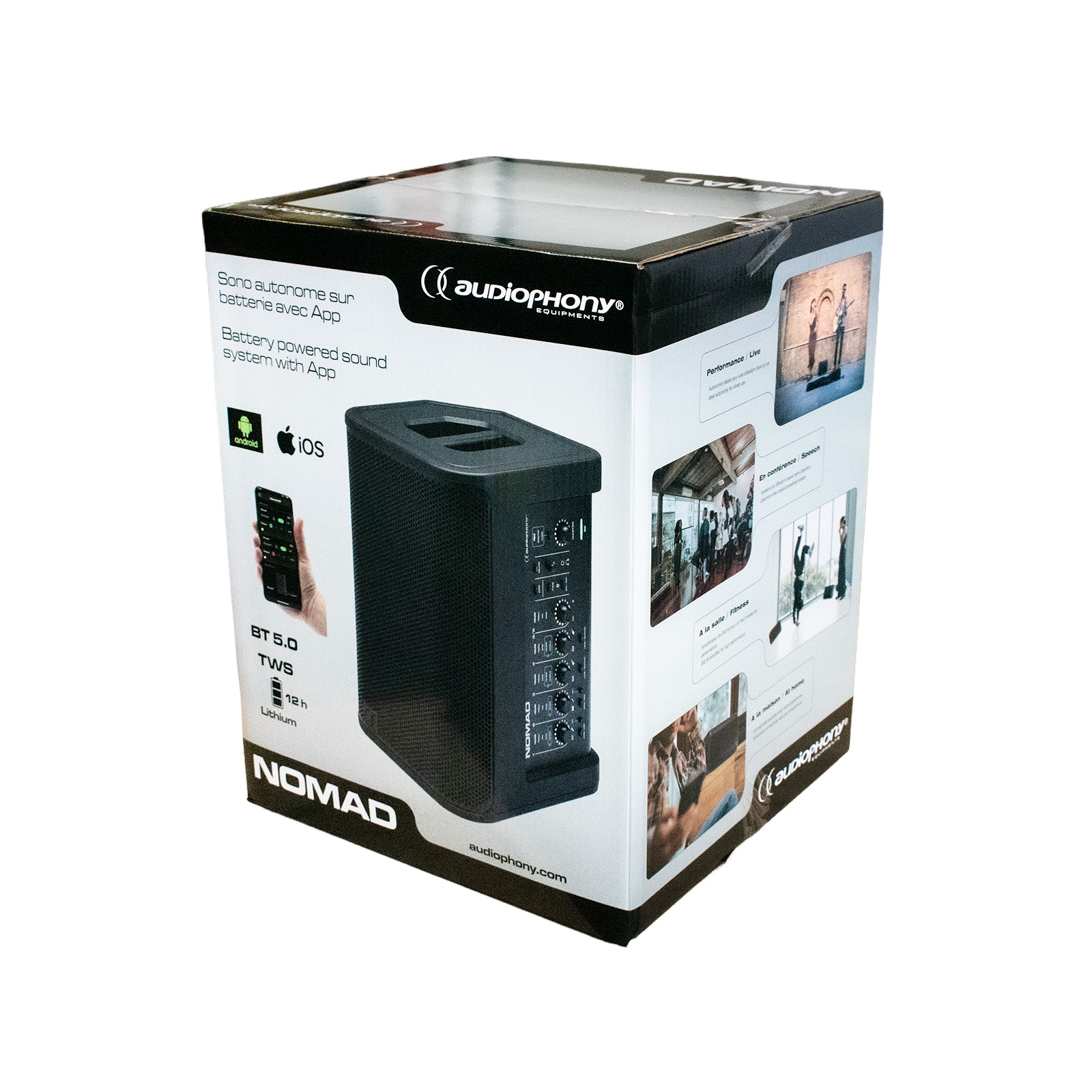 Audiophony NOMAD este o boxă activă portabilă cu acumulator, gândită pentru muzicieni, DJ, prezentatori, evenimente corporate și party-uri în aer liber. Oferă 200 W RMS, difuzor coaxial de 8" și un mixer digital integrat în 5 canale, totul într-o carcasă compactă, ușor de transportat, cu montare pe stativ de 35 mm.