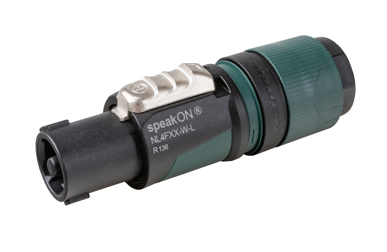 Conectorul de cablu speakON Neutrik cu 4 poli este proiectat pentru a asigura o conexiune fiabilă și robustă. Acesta dispune de un sistem de asamblare cu terminale cu șurub și un mecanism de prindere pentru a preveni tensiunea asupra cablului, fiind compatibil cu diametre de cablu între 10 și 16 mm.