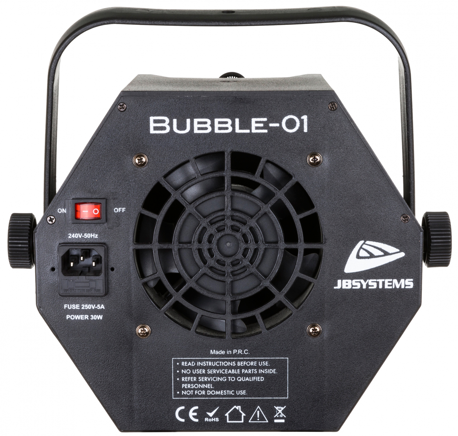 Mașina de făcut bule BUBBLE-01 este un echipament ideal pentru evenimente, producând bule de dimensiuni variate. Ventilatorul direcționează aerul exact în orificiul paletei pentru a evita stropirea lichidului pe podea. Funcționează cu un lichid special, gata de utilizare, care se toarnă într-un rezervor de 0,75 litri, asigurând funcționarea continuă timp de aproximativ 30 de minute.
